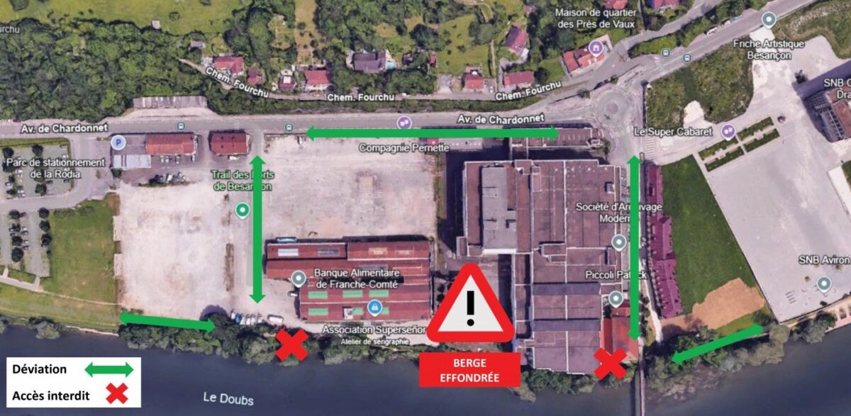 Une partie de la berge du Doubs, quartier Prés de Vaux, s’est effondrée. "Pour des raisons de sécurité l’accès à cette zone est désormais interdit. Des barrières et des panneaux ont été mis en place", explique Anne Vignot, la maire de Besançon.