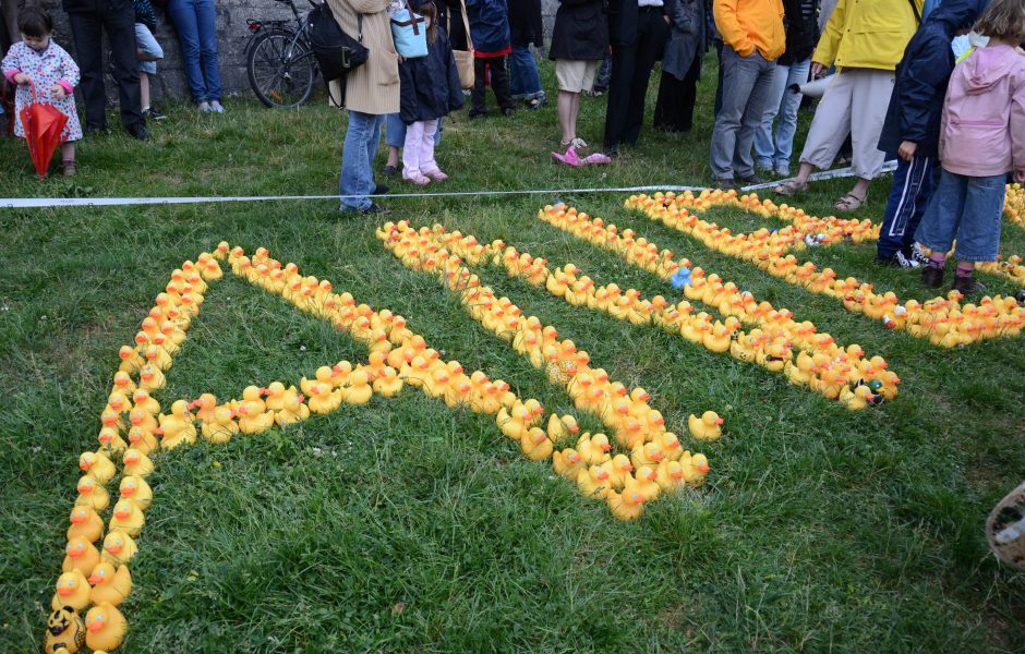 Samedi 14 mai. 16h30. Départ de la course de canards en plastiques. De nombreux enfants sont présents. Parapluies et bottes en caoutchouc sont de rigueur pour cette 2e course organisée par l’ANB. La première, en septembre 2009, avait réuni 1 200 canards sur le Doubs. Cette année, les canards sur le Doubs ont eu quelques difficultés pour patauger en raison du niveau du Doubs relativement bas et du courant faible. Un bateau-mouche a dû même reculer quelques mètres pour les laisser passer alors que le long du Doubs, enfants et parents admiraient leur spectacle et encourageaient leur petit protégé.