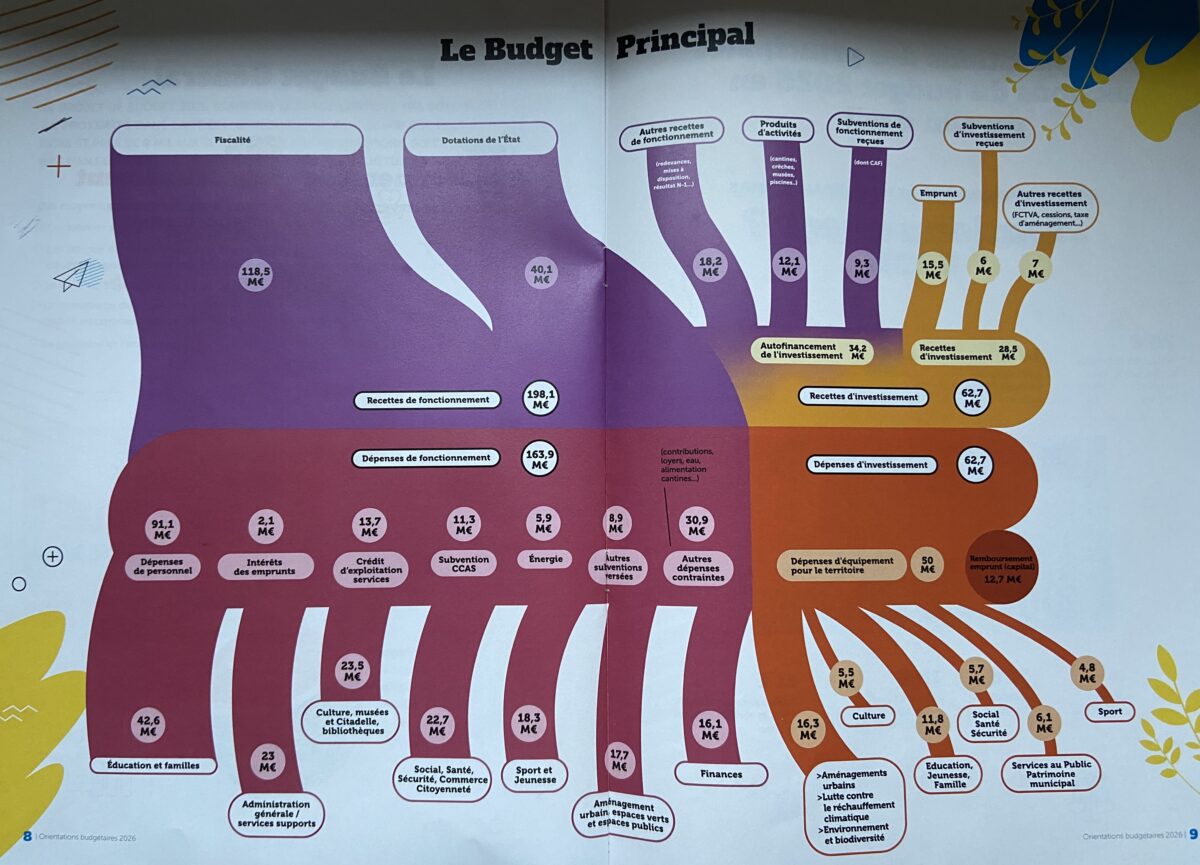 Le nouveau budget 2026 s’élève à près de 228 M€, soit une augmentation de 3 M€ par rapport à 2025, et est une fois de plus marqué par un haut niveau d’investissement de près de 63 M€ dont 50 M€ consacrés à l’équipement du territoire. Les dépenses de fonctionnement s’élèvent elles à plus de 165 M€ tous budgets (dont 91 M€ pour le personnel, 11,3 M€ de subvention au Centre communal d’action sociale (CCAS), 5,9 M€ pour l’énergie ou encore 8,9 M€ pour les autres subventions).
