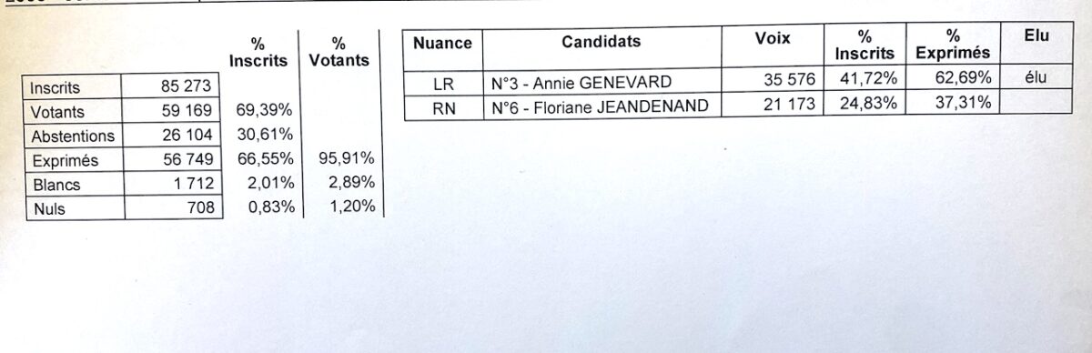 Résultats définitifs • Annie Genevard, candidate Les Républicains est arrivée en tête dimanche 7 juillet 2024 lors du deuxième tour des élections législatives avec 62,69 % des voix. Elle devance Florianne Jeandenans, candidate du Rassemblement national (37,31%).