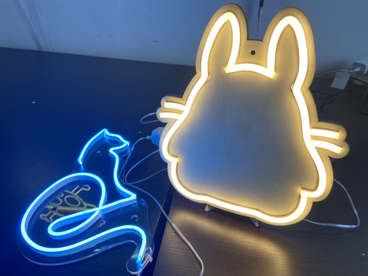 Pour un aspect plus "naturel", rustique ou encore plus "cocooning", les néons peuvent également être réalisés sur une plaque de bois plutôt que sur un plexiglass. La réalisation peut ainsi être proposée en version murale ou sur pied.