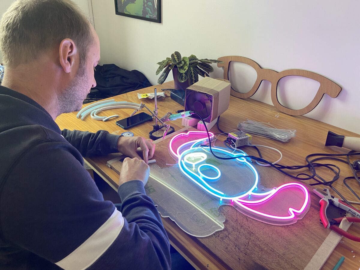 C’est une proposition "d’atelier volant" à Hop hop hop qui a permis au graphiste de développer cette seconde activité professionnelle. L’association lui mettant à disposition un atelier pendant deux mois qui lui a ainsi permis de démarrer son activité et de "développer la technique", nous explique Maxime. Pour mettre à profit cet essai, il s’était fixé un challenge à la fin des deux mois : "j’avais pris un stand à Ludinam pour exposer". Le salon s’est par la suite bien passé et l’artisan a ainsi pu commencer à prendre des contacts pour développer son entreprise. À terme, le Bisontin prévoit d’arrêter son activité de graphiste pour se consacrer uniquement aux néons.