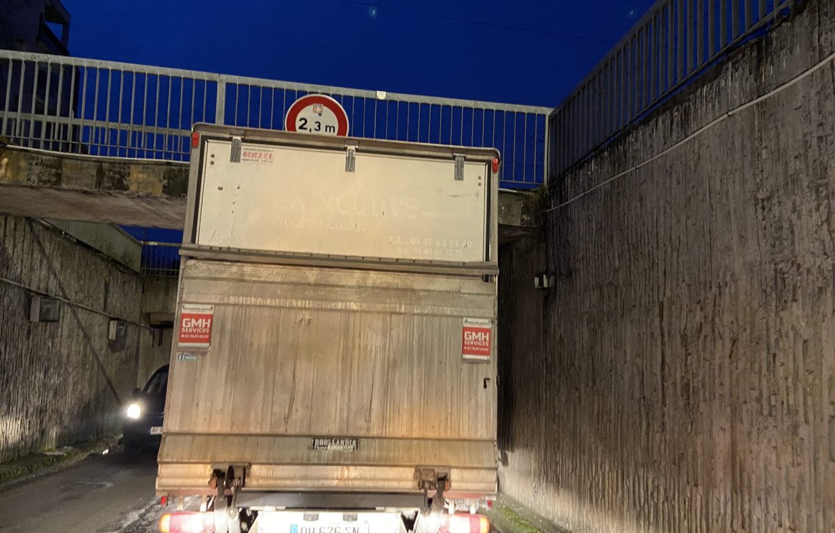 C’était le cas ce mardi matin lorsqu’un camion immatriculé dans l’Essonne a constaté trop tard malheureusement que son camion dépassait les 2,30 m, hauteur maximale autorisée pour espérer passer sans encombre.
