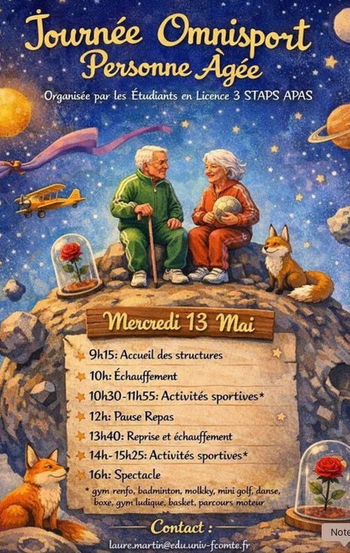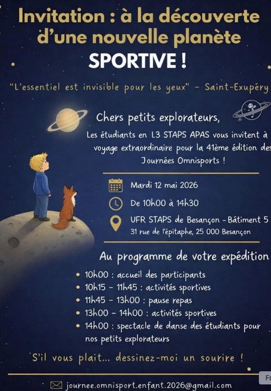 Remarques : cet événement est rendu possible grâce au financement de l’association étudiante BI’APAS, qui soutient les projets liés à la promotion de l’activité physique et à la valorisation de la filière APAS.
