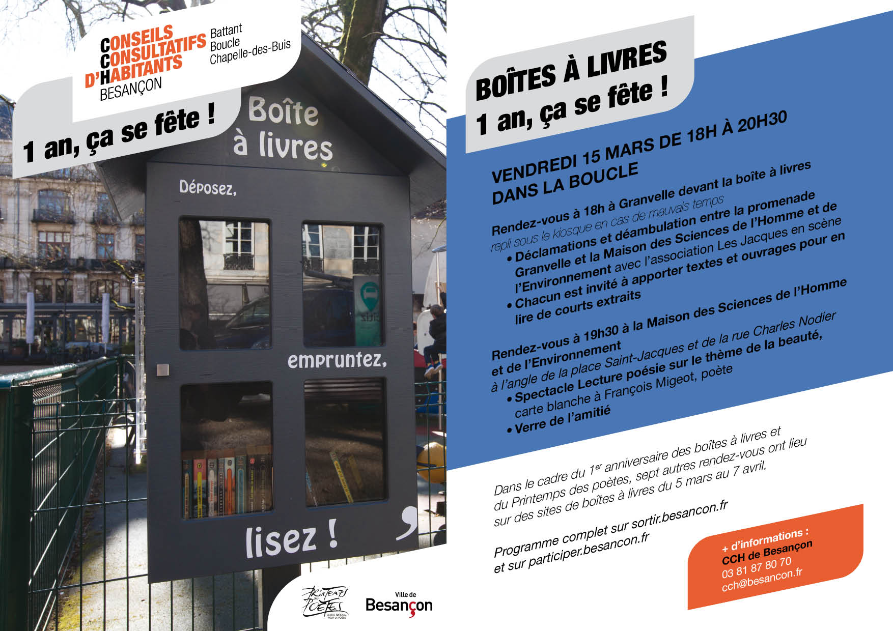 Conjuguant le printemps des poètes et le premier anniversaire de l’installation à Granvelle et dans d’autres quartiers de la ville des premières boîtes à livres, carte blanche sera donnée à François Migeot qui donnera à entendre diverses facettes de sa poésie (Traces, 2017, Des voix à travers le feuilles, 2018, à Atelier du Grand Tétras, AGT). Il invitera aussi la poésie contemporaine latino-américaine avec José Antonio Ramos-Sucre (El Canto anhelante, AGT) et Eugenio Montejo (Venezuela) avec des poèmes traduits en français par lui. Quelques Démolitions (poèmes d’humeur) ponctueront la lecture sans oublier que le thème de l’année pour le printemps des poètes est « La beauté ».