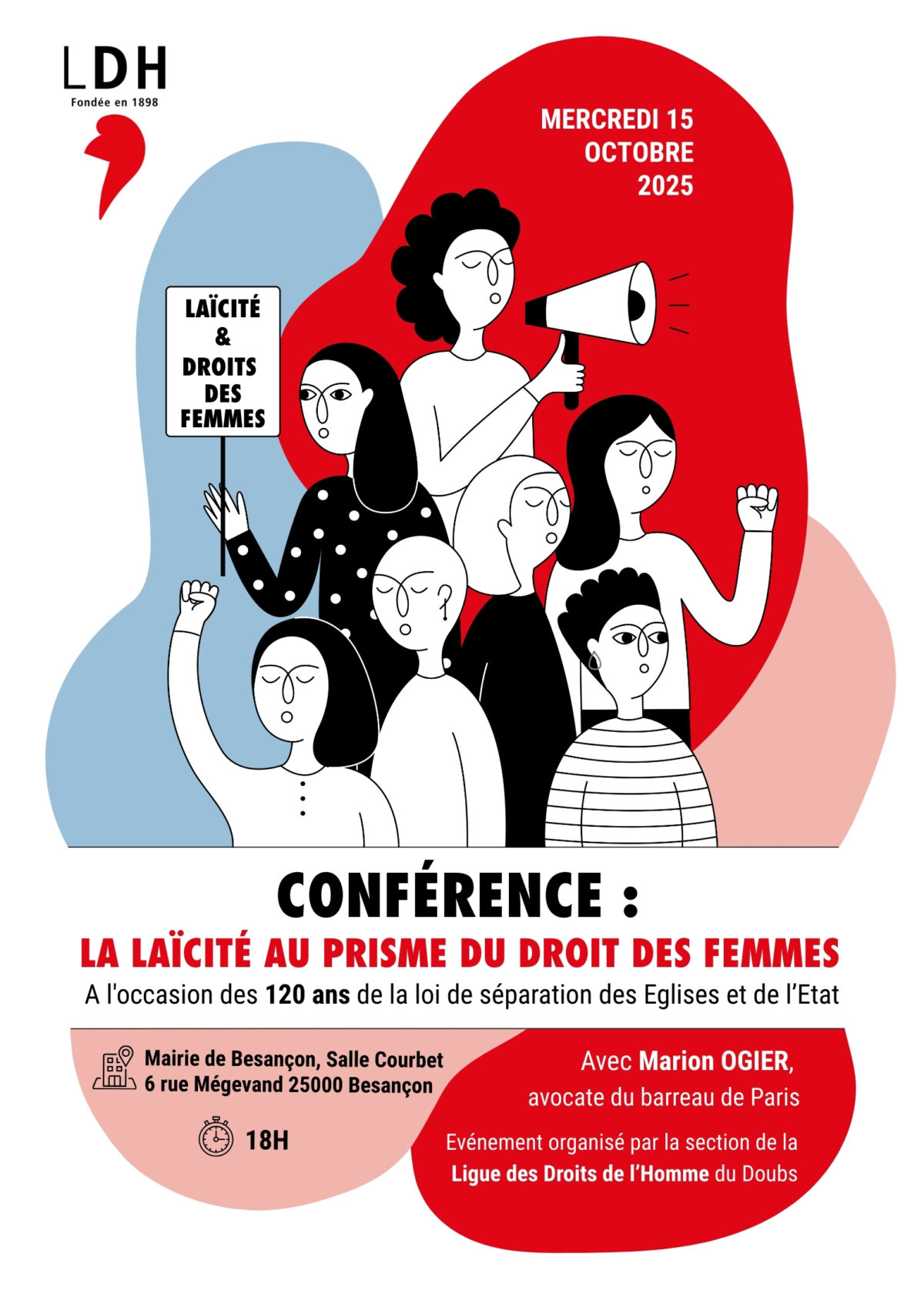 La section bisontine de la Ligue des droits de l’Homme (LDH) organise, ce mercredi 15 octobre à 18h, une conférence à la salle Gustave Courbet de la mairie de Besançon pour marquer les 120 ans de la loi du 9 décembre 1905 sur la séparation des Églises et de l’État.