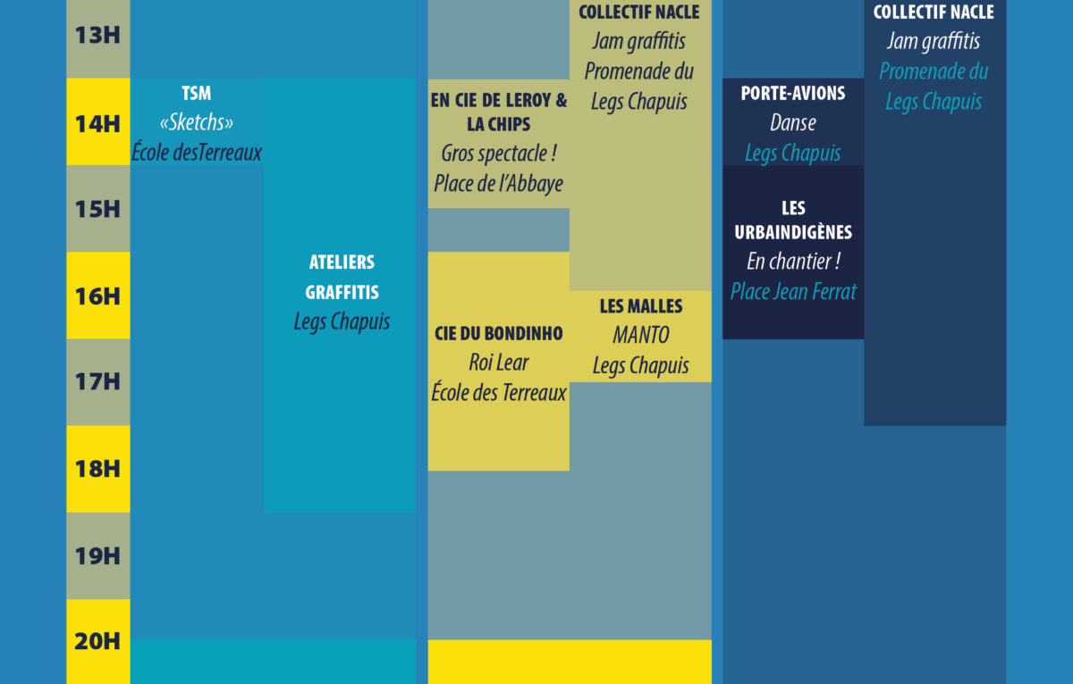 Trois jours de création culturelle seront proposés au public, dans l’atmosphère d’un festival de rues : de la musique lors des deux soirées de concerts en plein air au centre-ville, de l’art urbain par le biais des ateliers et des démonstrations de graffitis sur le mobilier urbain, de l’improvisation lors de matches et de visites guidées originales dans le cœur historique, des spectacles enfin, pour les petits et pour les grands grâce à des compagnies de théâtre de rues.