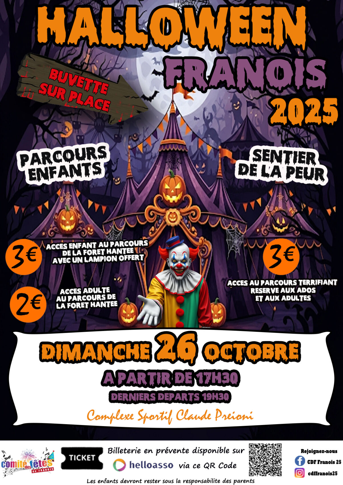Le Cirque Maléfique arrive pour Halloween. Attention, âmes sensibles s'abstenir ! Le Comité des Fêtes de Franois vous invite à une soirée d'Halloween terrifiante et inoubliable sous le chapiteau du Cirque Maléfique ! Préparez-vous à frissonner, rire... et peut-être même crier un peu le dimanche 26 octobre 2025 à partir de 17h30.