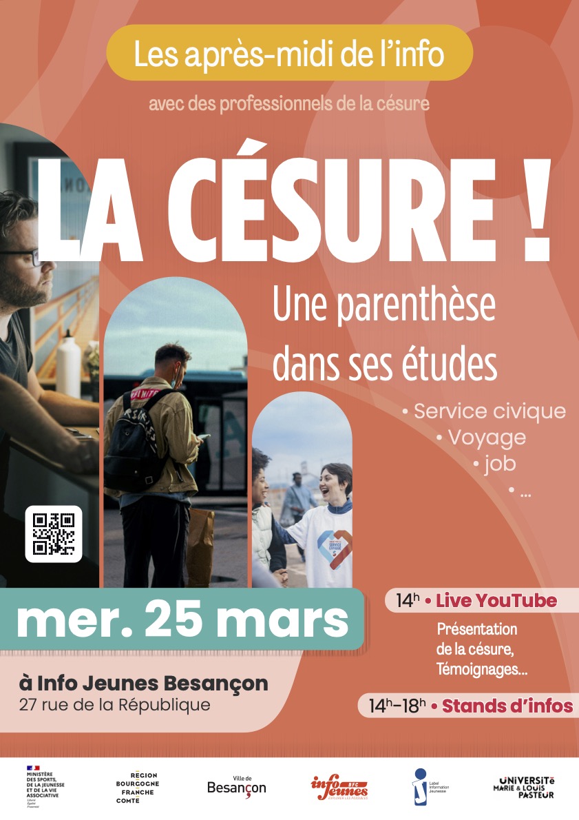 Info Jeunes BFC et l'Université Marie et Louis Pasteur organisent un après-midi d'informations sur la césure mercredi 25 mars 2026 de 14h à 18h au centre Info Jeunes Bourgogne Franche-Comté à Besançon, à suivre également sur YouTube.