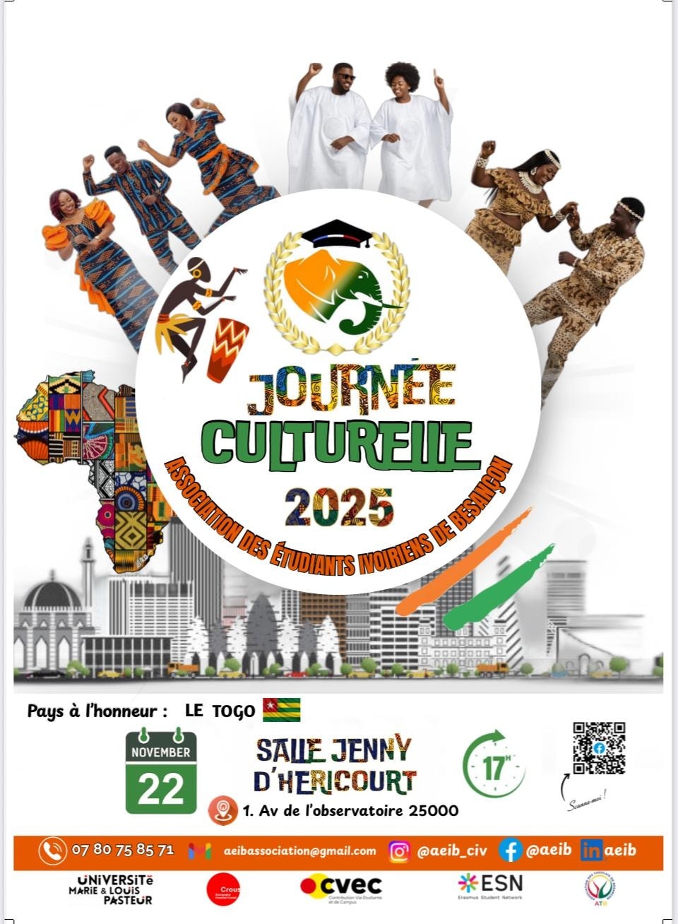 L’Association des Étudiants Ivoiriens de Besançon (AEIB) a pour objet de rassembler tous les étudiants ivoiriens de Besançon afin de resserrer les liens de fraternité par des rencontres d’échanges, de faciliter l’entraide, et défendre les intérêts, d’apporter selon ses moyens les solutions aux problèmes socio-économiques et pédagogique des membres, de faire connaître la Côte d’Ivoire par des activités sportives, culturelles, sociales et artistiques. C'est donc dans la perspective de faire connaître la Côte d'Ivoire que l’association organise le samedi 22 novembre 2025 à partir de 17h, à la salle Jenny d'Héricourt du CROUS de Besançon, la journée culturelle ivoirienne. Celle-ci aura comme pays invité d'honneur le Togo.