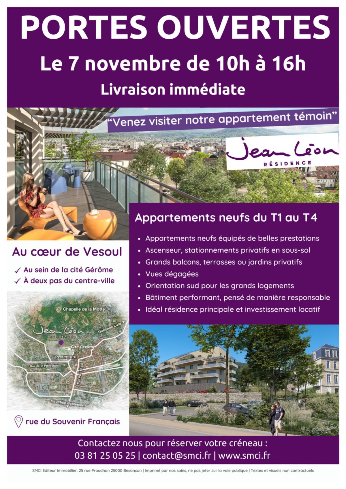 Le promoteur immobilier SMCI vous invite à découvrir la résidence Jean Léon, située rue du Souvenir Français à Vesoul, à l’occasion d’une journée portes ouvertes le vendredi 7 novembre, de 10h à 16h.