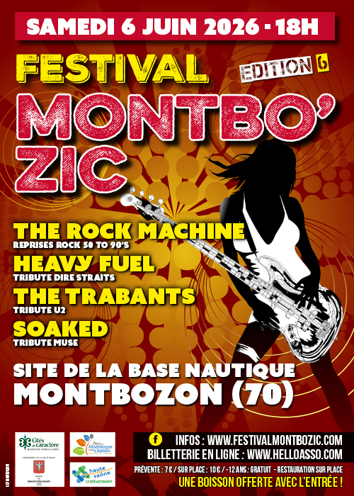 La 6e édition du festival Montbo’Zic se déroulera samedi 6 juin 2026 sur le site de la base nautique de Montbozon, en Haute-Saône, au bord de la rivière l’Ognon. L’événement reste fidèle à son format d’une journée.