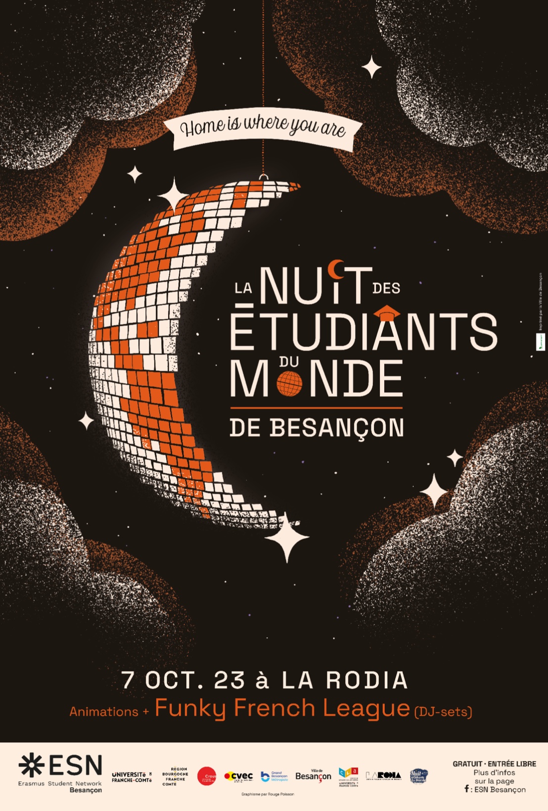 Le samedi 7 octobre 2023, ESN Besançon organise la Nuit des étudiants du monde à La Rodia, une soirée permettant de souhaiter officiellement la bienvenue aux étudiant(e)s venant d’ailleurs.
