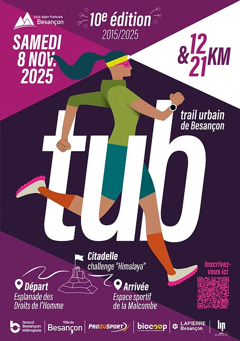 Organisé par le club alpin français le trail urbain de Besançon (TUB) aura lieu cette année le samedi 8 novembre 2025 au départ de l’esplanade des Droits de l’Homme pour une arrivée attendue à l’espace sportif de la Malcombe.