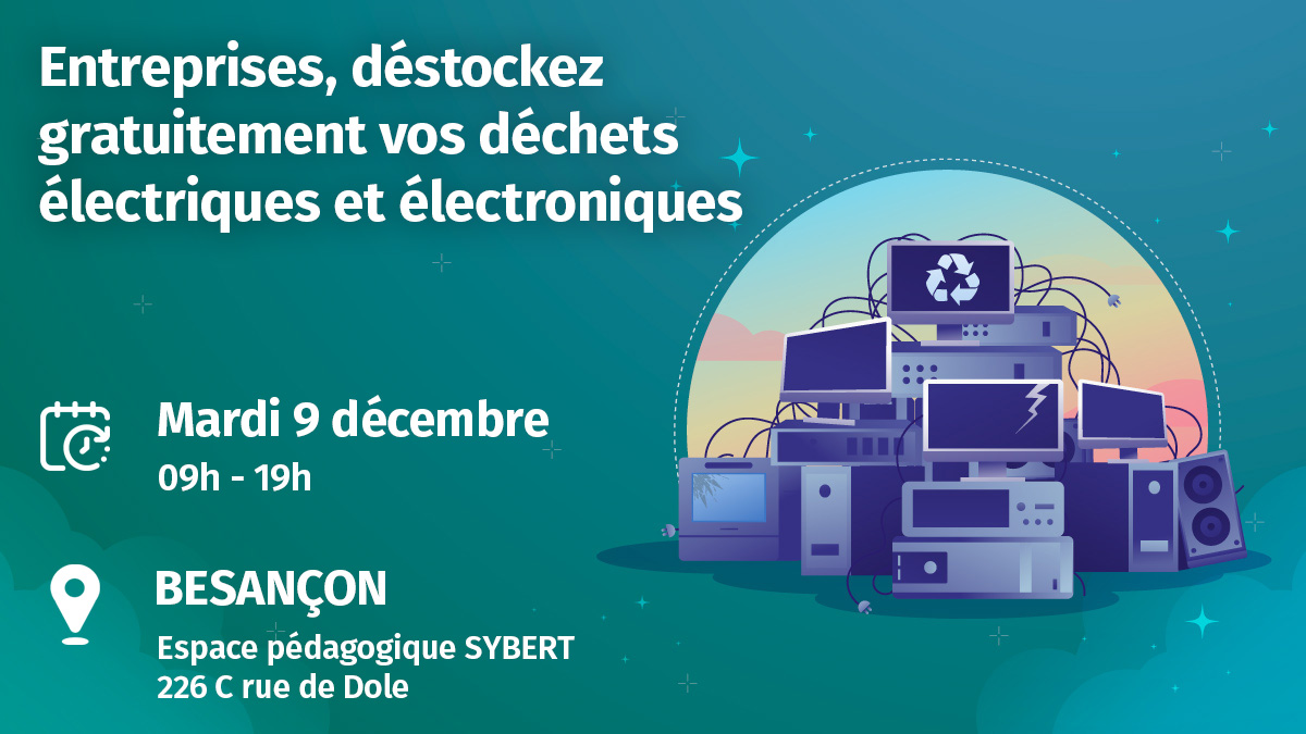La CCI Saône-Doubs, en partenariat avec le Sybert, Saint-Vit Informatique et Ecosystem, organise une opération exceptionnelle de destockage de Déchets d’équipements électriques et électroniques (DEEE) le 9 décembre 2025. Les entreprises du territoire sont invitées à venir se débarrasser gratuitement de ce type de déchet à l'espace pédagogique du Sybert, rue de Dole à Besançon.