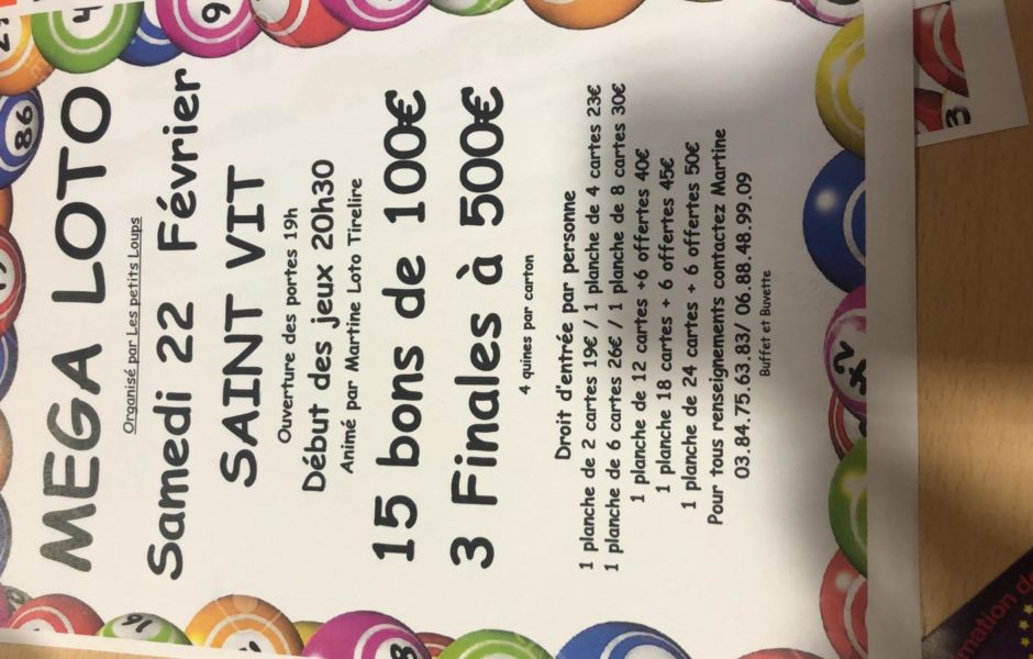 Méga Loto des Ptits Loups le samedi 22/02 à St Vit à partir de 19h00.