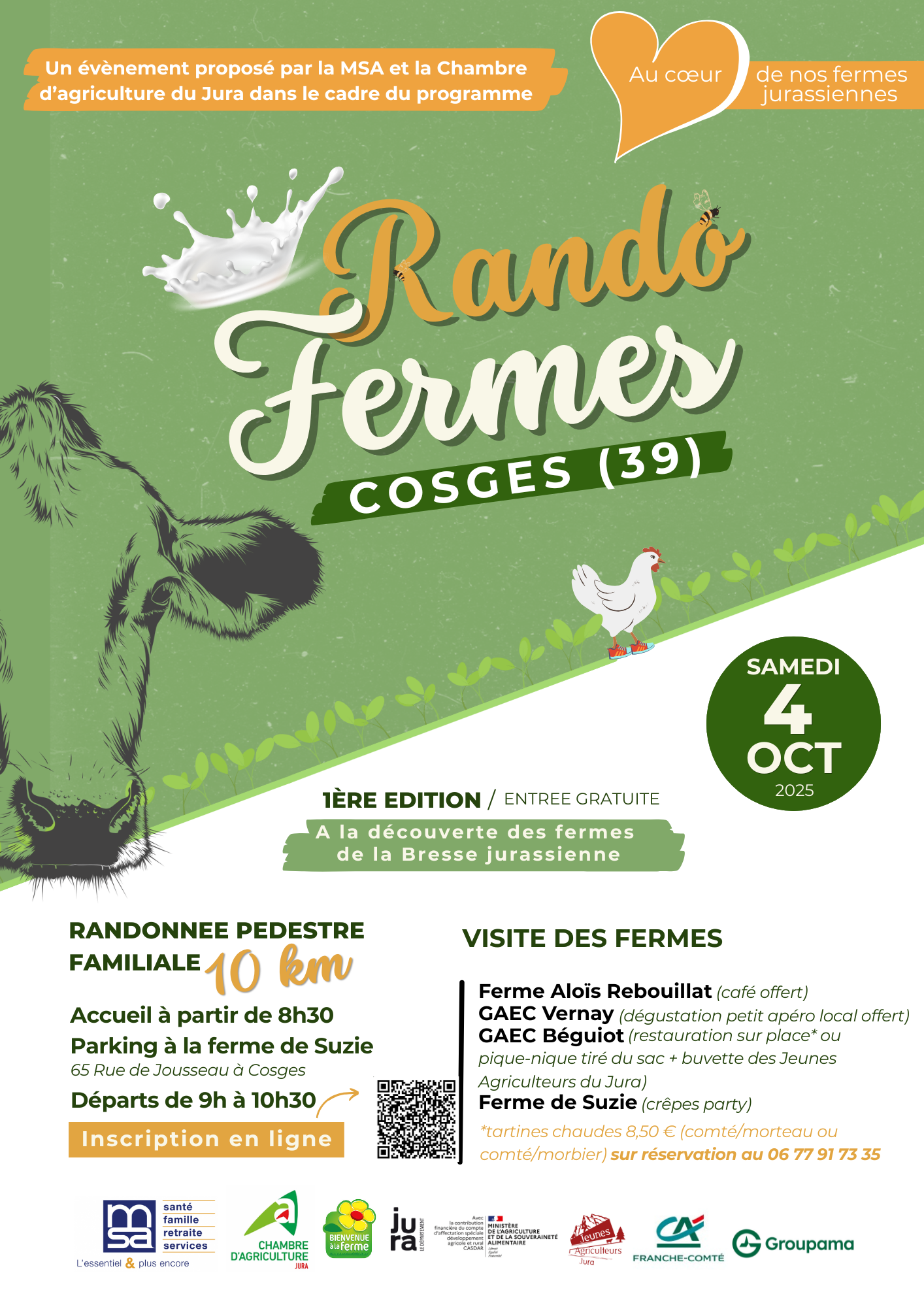 Randonnée pédestre familiale gratuite de 10km à la découverte des fermes de la Bresse jurassienne. Visite des fermes :