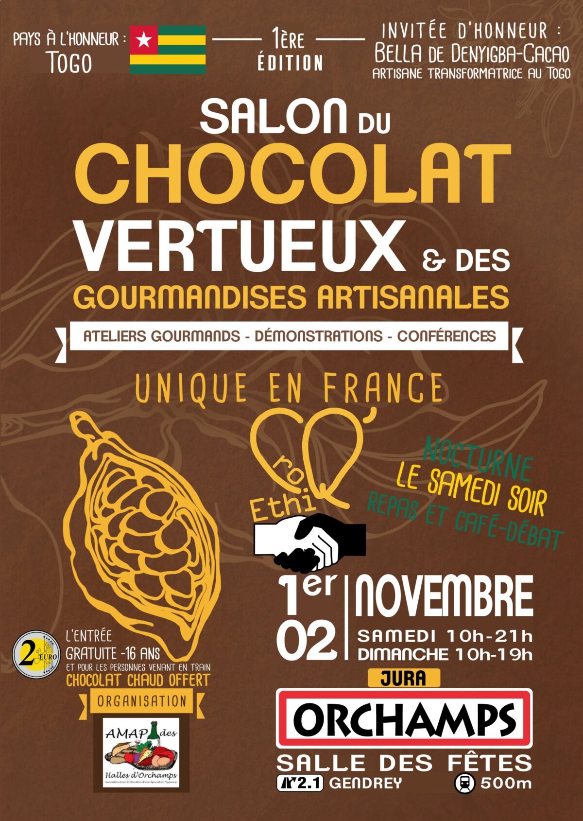 Le salon du chocolat vertueux (écoresponsable), se tiendra à la salle des fêtes d'Orchamps les 1er et 2 novembre 2025.