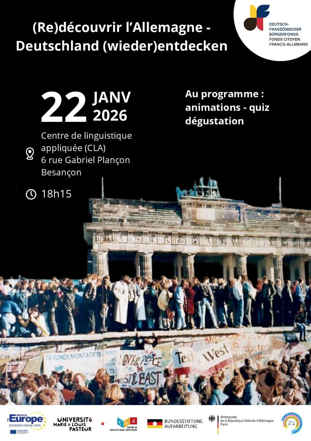 Afin de célébrer la journée franco-allemande le 22 janvier 2026, la Maison de l'Europe en Bourgogne-Franche-Comté et le Centre de linguistique appliquée (CLA) de Besançon organisent une soirée interculturelle dédiée à l'histoire allemande après 1945 et au rôle des relations franco-allemandes dans la pacification du continent.