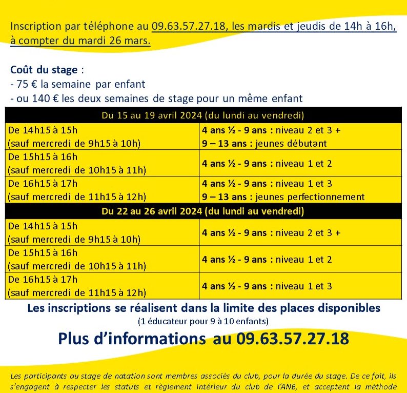 Stage d'apprentissage et de perfectionnement de la natation pour les enfants de 4 ans 1/2 à 9 ans ou de 9 à 13 ans. Piscine Mallarmé à Besançon. Une séance de trois-quarts d'heure par jour du lundi au vendredi. Séances l'après-midi le lundi, mardi, jeudi et vendredi ; le matin le mercredi.