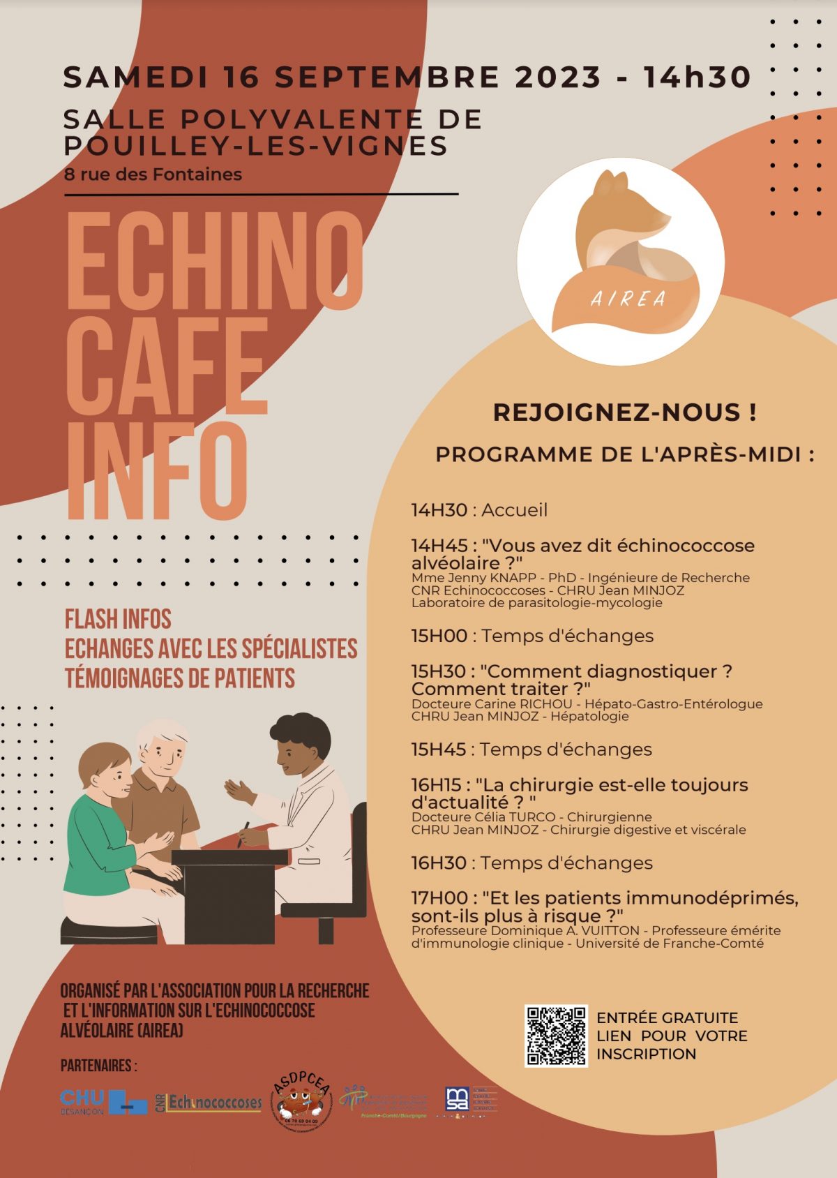 Le samedi 16 septembre, à partir de 14h30, à la Salle polyvalente de Pouilley-les-Vignes (8, rue des Fontaines), une "Échino-café-info" est proposée par l’Association pour l’Information et la Recherche sur l’Échinococcose Alvéolaire (AIREA).