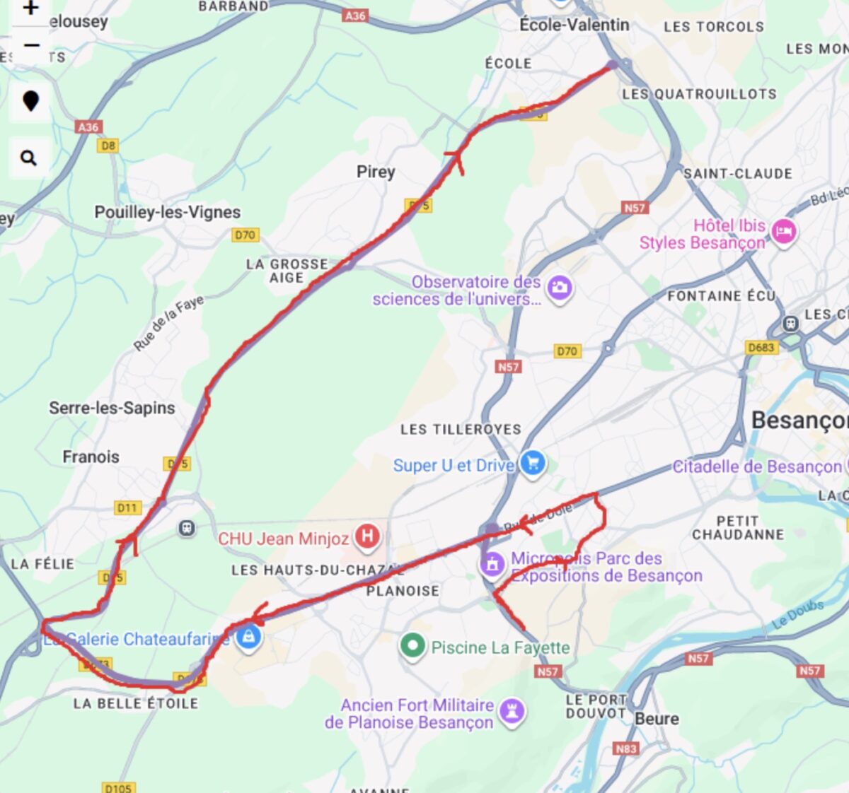 - Dans le sens sud ? nord, depuis Beure : les automobilistes sont déviés au niveau de Micropolis pour récupérer la rue de Dole au niveau du rond-point de l’Intermarché. Les automobilistes passent ensuite par les Hauts du Chazal puis Pirey afin de récupérer la RN57 au niveau d’Ecole-Valentin.