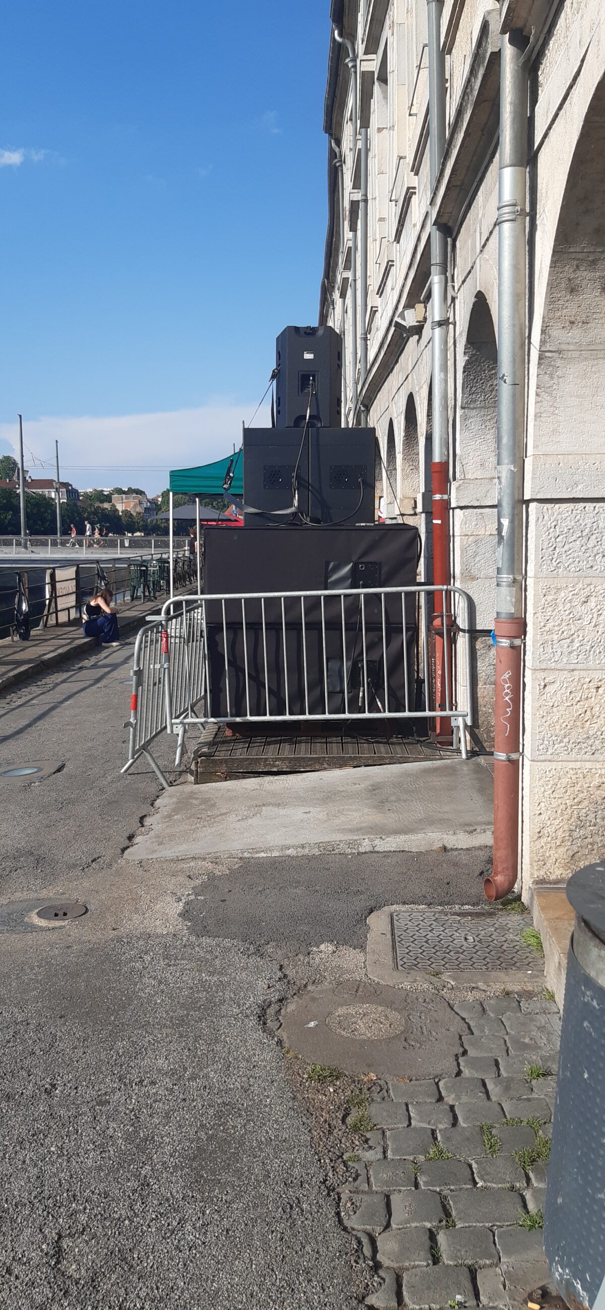 Comment ne pas faire ici mention de la soirée du 21 juin dernier, demeurée illustre dans l'esprit des riverains et professionnels du quartier Vauban ? Un relevé sonométrique en lien avec le concert s'étant tenu au "Tandem" fut réalisé au moyen d'un appareil homologué par les services techniques de la municipalité ; les mesures établies avoisinent tout au long des festivités les 110 Décibels, avec un pic à 120,9 Décibels. La clientèle des établissement contigus déplora allègrement cette exposition contrainte à une clameur assourdissante, quand les proches (et même...moins proches) débiteurs se virent imposer la réforme complète de l'atmosphère projetée d'une vêprée qu'ils auguraient précisément, "conviviale". S'agissant des habitants du quai, il ne leur fut d'autres possibilités offertes que celle de subir, des heures durant, fenêtres closes, la chaleur suffocante baignant leur appartement, et surtout, les trémulations continues ébranlant indistinctement les façades des immeubles, jusqu'au moindre interstice de chacun de leur logement.