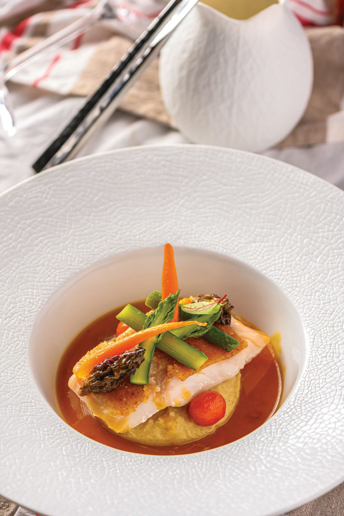 - Dressage. Dans une assiette chaude, mettez la mousseline de céleri, puis déposez un pavé de lieu jaune et versez la sauce.