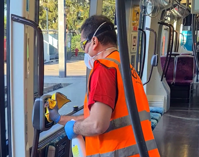 Au-delà, la question du nettoyage et de la désinfection à bord du matériel roulant a été une des priorités de la société avec un doublement de l'activité de nettoyage en lien avec la société prestataire Onet. "Nous avons mis en place des mesures drastiques avec protocole pécis de nettoyage et de désinfection à l'aide de produits virucides" indique Frédéric Lambert, directeur maintenance et patrimoine. "Les bus et tramways qui roulent sont nettoyés tous les jours". Un premier agent balaie et retire les déchets. Un second agent nettoie tous les points de contact (valideurs, barres de maintien, poignées, sièges, parois verticales, etc. ). Un troisième s'occupe de la cabine du conducteur de la cordelette du pare-soleil au portillon. Le sol est ensuite récuré avec toujours, un produit virucide.