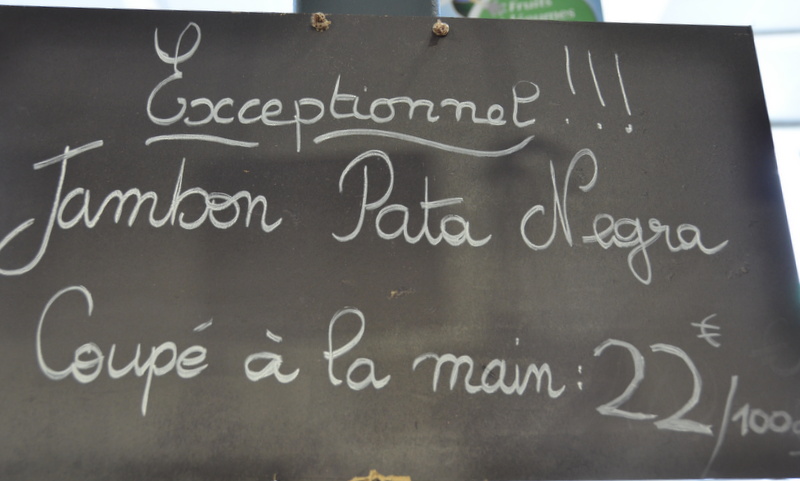 Autant dire qu'à 220 euros le kilo à la Bodega ("800 euros à Lyon et 1000 euros à Paris" selon le gérant) et avec un pedigree comme le sien, le Pata Negra est un véritable produit de luxe ; l'unique exemplaire de toute la Franche-Comté est en face de moi, trônant fièrement au centre du traiteur bisontin. Je m'attends donc à manger la "Rolls-Royce" du jambon.