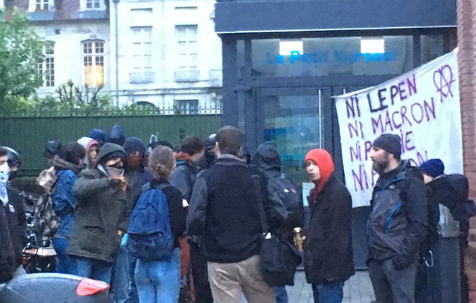 Après l'annonce des résultats de la présidentielle, des anarchistes ont décidé de déambuler dans les rues de Besançon. Surveillés de prés par des policiers sur place, Ils sont partis du Kurssal avant d'emprunter la grande rue en direction de Battant. Deux agences bancaires ont été tagués et deux anticapitalistes ont été interpellés par la police.
