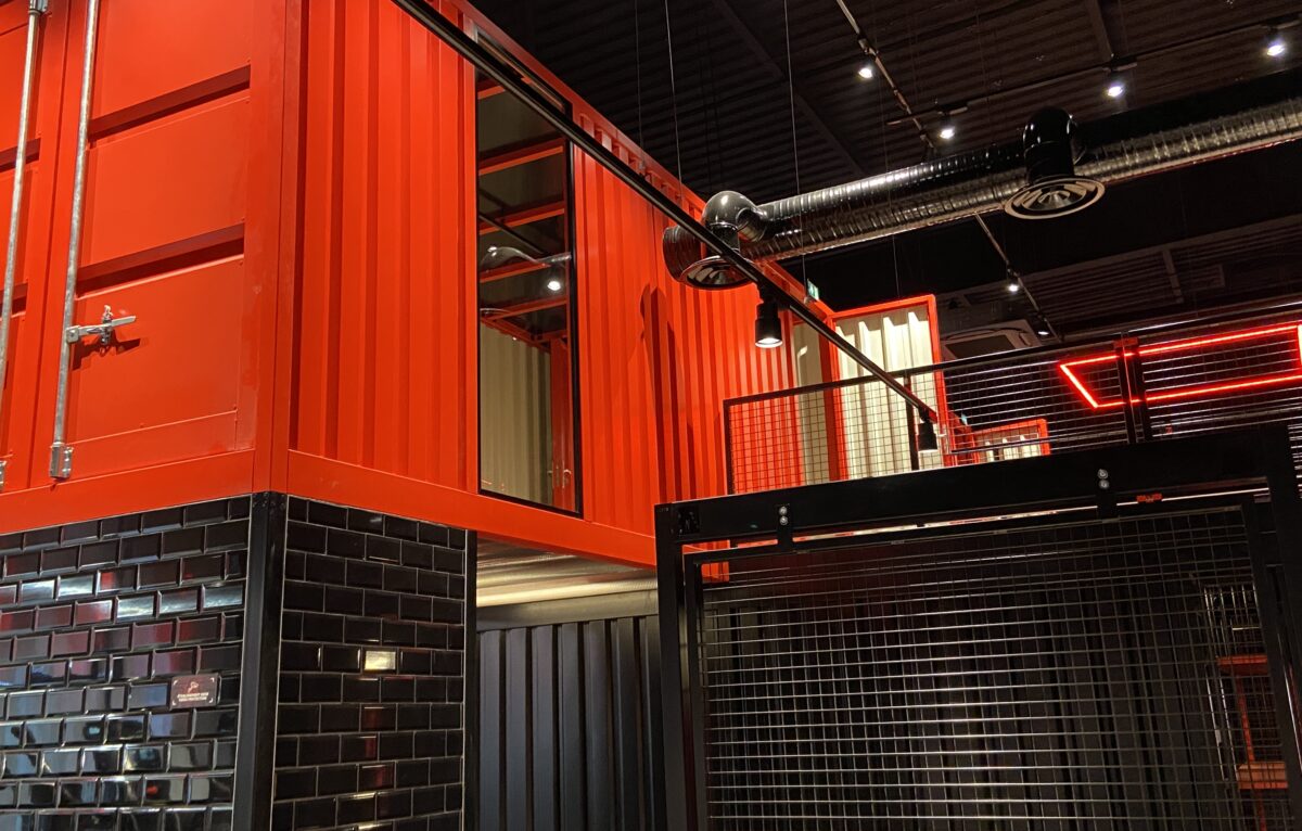 Dès l’entrée, l’importance accordée au design et aux détails saute aux yeux. Des conteneurs rouges et noirs imbriqués donnent une ambiance très industrielle tandis qu’en face de nous, le logo On air qui déploie ses ailes donne le ton et souligne une identité forte.