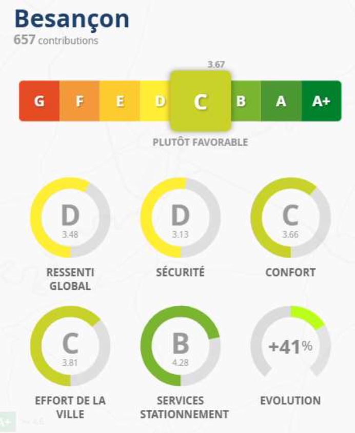 Dans le détail, le communiqué de la municipalité indique que ”les services proposés tels que le stationnement et la location de vélos sont classés favorablement (B)”. Autrement dit : les équipements et services afférents au vélo (emplacements, offres location) bénéficient d’une bonne appréciation. Cet indicateur ”B” place Besançon au-dessus de la moyenne pour cet aspect précis.