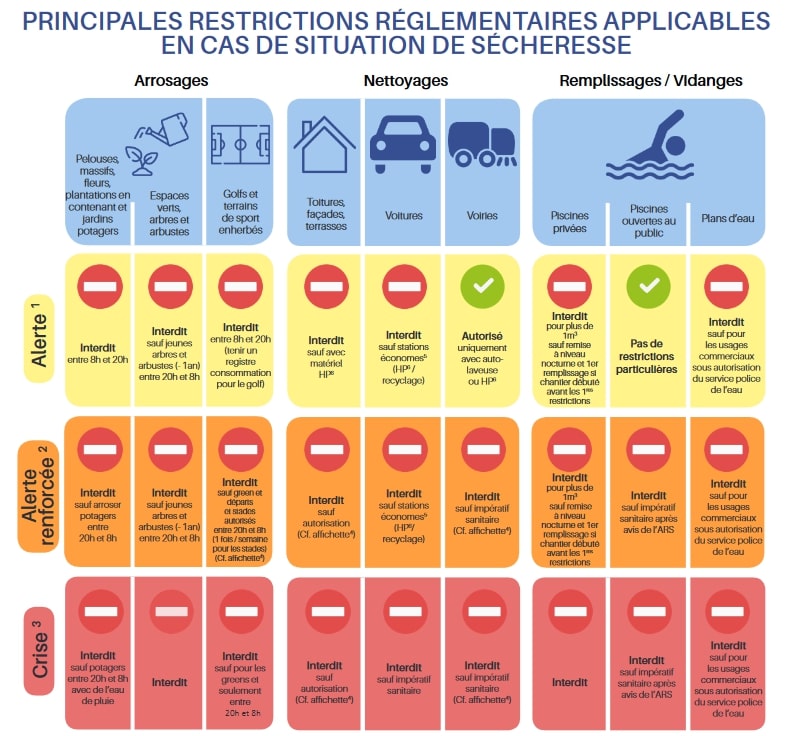 Pour ne citer que quelques-unes d’entre elles, l’arrosage des pelouses et massifs fleuris et plantation en pots est interdit (sauf systèmes de goutte à goutte), tout comme l’arrosage des jardins potagers entre 8h et 20h. Les vidanges et remplissages des piscines privées et publiques sont également interdits (sauf exceptions). Tout comme le lavage de véhicules à domicile qui ne peut s'effectuer que dans des stations équipées d’un système de recyclage d’eau.