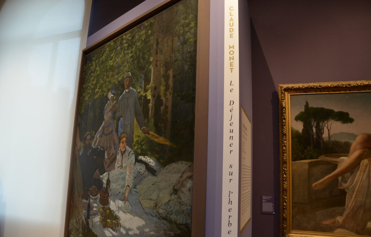 Le tableau a été découpé en trois fragments par l’artiste en 1884 (le troisième morceau est aujourd’hui disparu), et la composition ainsi créée, met en scène quatre personnages installés dans une clairière. Trois sont reconnaissables. On y remarque aux côtés de Camille Doncieux, la compagne de l’artiste, et Frédéric Bazille, le camarade et peintre, un homme assis comme s’il était le maître de cérémonie. Il présente certains traits particuliers qui pourraient être ceux de Gustave Courbet : cheveux, barbe et yeux noirs, embonpoint, charisme. Ces caractéristiques physiques sont bien connues ; l’artiste multiplie depuis ses débuts, les autoportraits, et se forge une image publique qui fait de lui l’un des peintres les plus caricaturés du XIXe siècle.