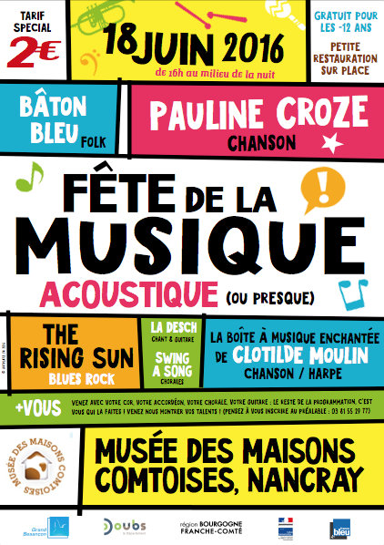 C'est dans le lieu extraordinaire et vaste du musée de plein air des Maisons Comtoises que la fête de la musique acoustique (ou presque) se déroulera dans une ambiance chaleureuse et familiale. En cas de pluie, un chapiteau haut en couleur s'élèvera pour profiter des joies de la musique bien au sec !