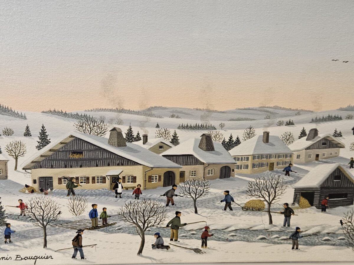 Denis Bauquier a une prédilection pour les paysages enneigés, quand la nature est recouverte de son blanc manteau. Il lui arrive même de planter son chevalet dans la neige ou sur le lac gelé. Il se délecte alors de dessiner les fermes comtoises avec les montées de granges, les cheminées et les "tuyés" qui fument, les églises qui "clairent" dans la nuit étoilée, les stères de bois bien rangées, les lavoirs ou les fontaines autour desquelles les habitants se retrouvent. Il a l'art de nous restituer toute l'ambiance un peu nostalgique mais en même temps joyeuse de son enfance.