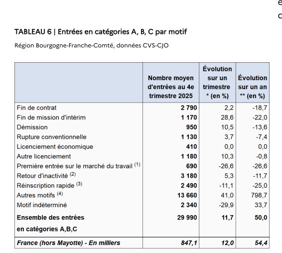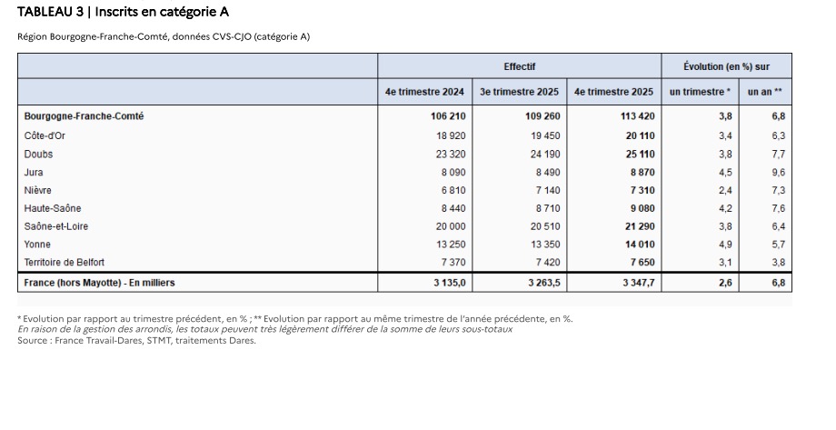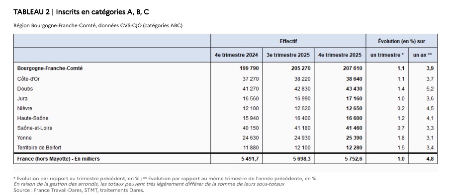 Au 4e trimestre 2025, en Bourgogne-Franche-Comté, les évolutions du nombre de demandeurs d’emploi en catégories A, B, C se situent entre +0,2 % dans la Nièvre et +1,8 % dans l’ Yonne. Sur un an, elles se situent entre +3,1 % dans l’ Yonne et +5,2 % dans le Doubs.
