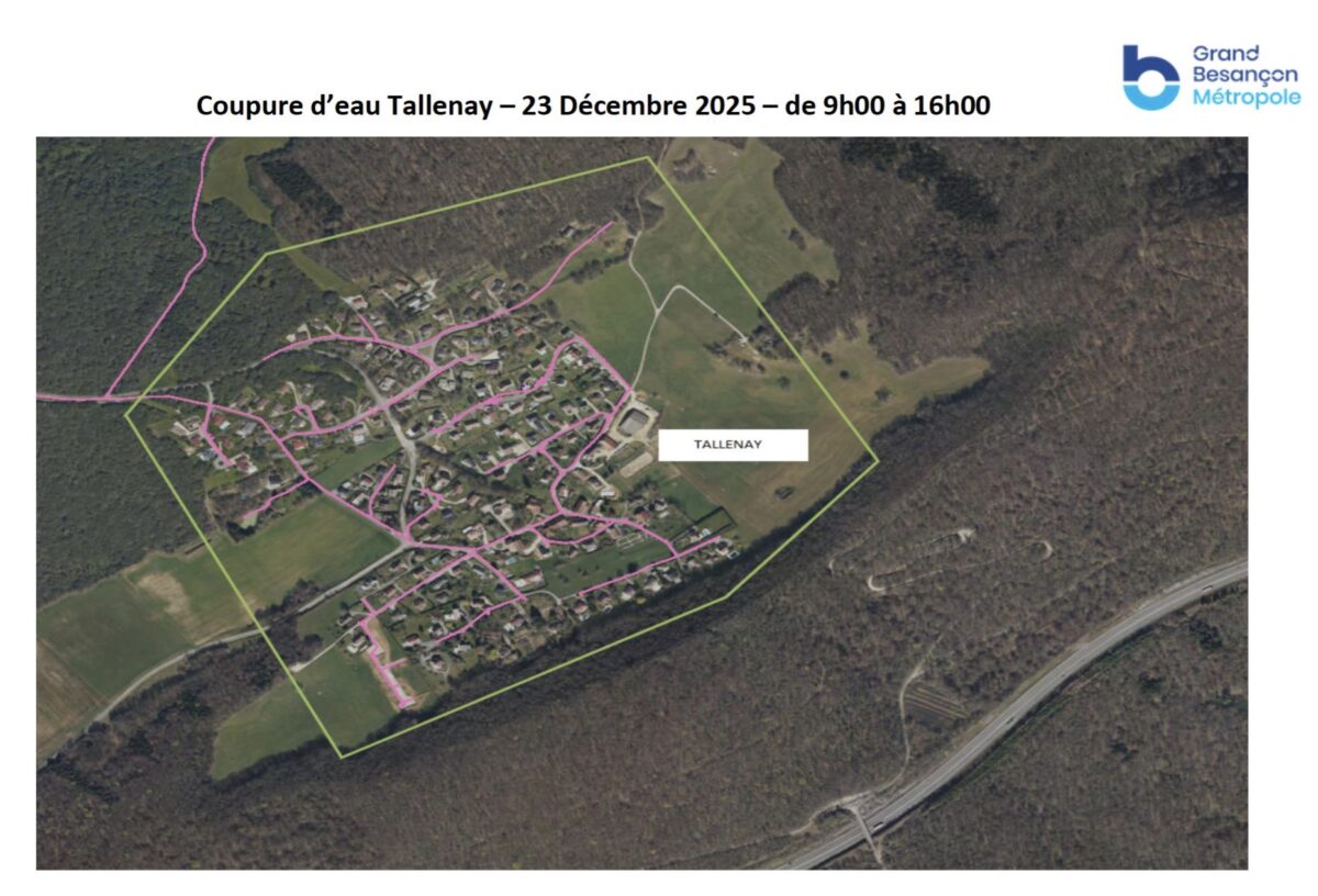 Grand Besançon Métropole informe les habitants de la commune de Tallenay qu’une coupure temporaire de l’alimentation en eau aura lieu le mardi 23 décembre 2025, de 9h à 16h, en raison de travaux de maintenance et de sécurisation du réseau.