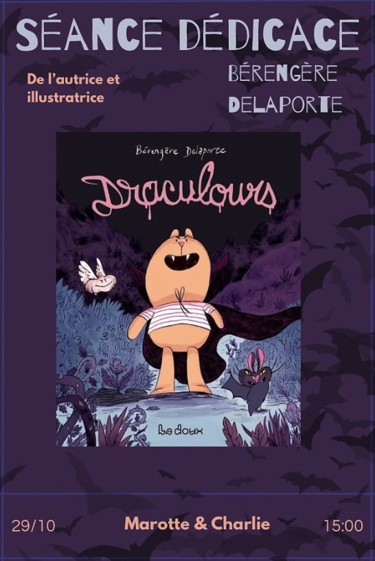 - Le mercredi 29 octobre, l’illustratrice bisontine Bérangère Delaporte viendra en dédicaces l’après-midi pour présenter sa dernière bande dessinée Dracul’ours à partir de 15h.