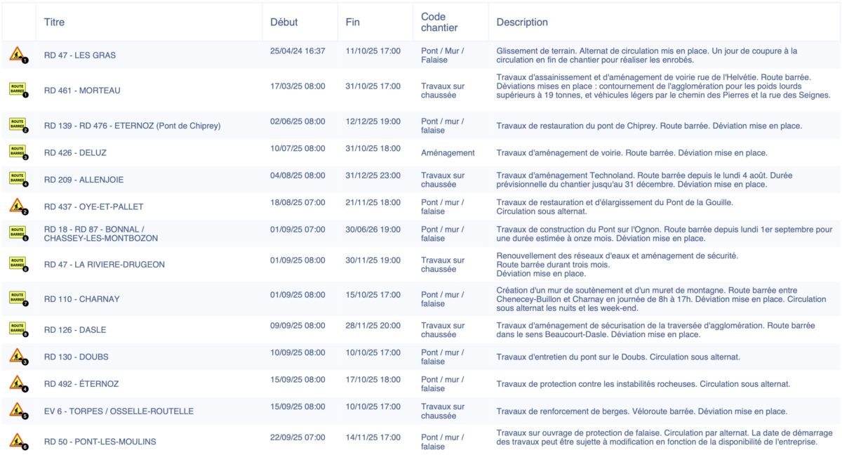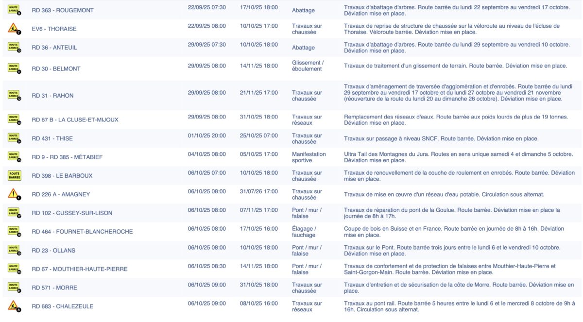 Les perturbations majeures sur le réseau départemental sont consultables sur le site d’information du Département www.inforoute25.fr