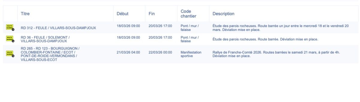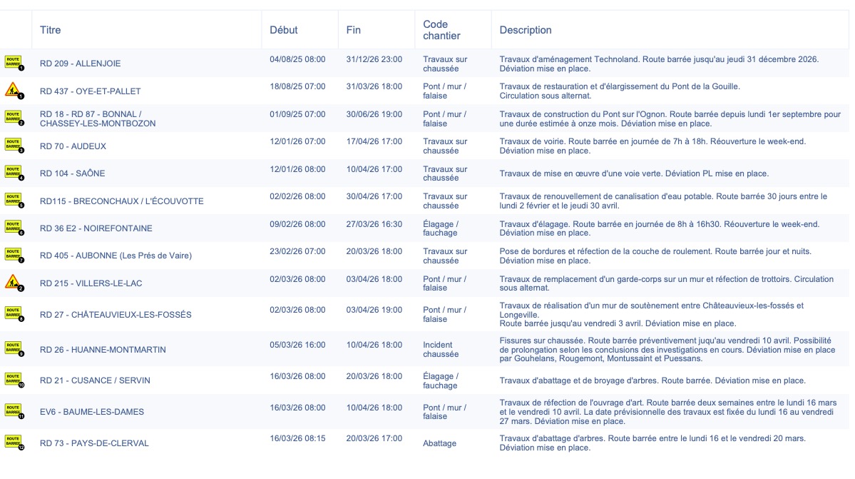 Voici les travaux qui se dérouleront du lundi 9 au vendredi 13 mars 2026 sur les routes du département du Doubs.