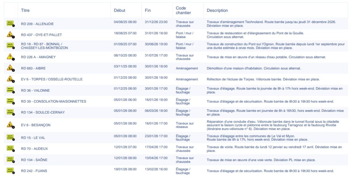Voici les travaux qui se dérouleront du lundi 12 au vendredi 16 janvier 2026 sur les routes du département du Doubs.