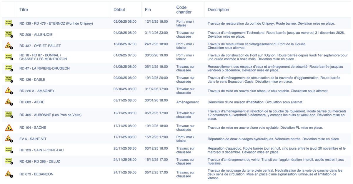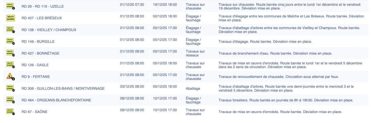 Voici les travaux qui se dérouleront du lundi 1er au vendredi 5 décembre 2025 sur les routes du département du Doubs.