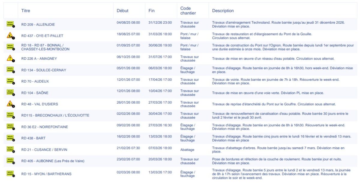 Voici les travaux qui se dérouleront du lundi 9 au vendredi 13 février 2026 sur les routes du département du Doubs.