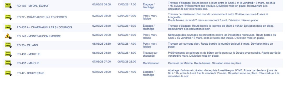 Voici les travaux qui se dérouleront du lundi 2 au vendredi 6 mars 2026 sur les routes du département du Doubs.