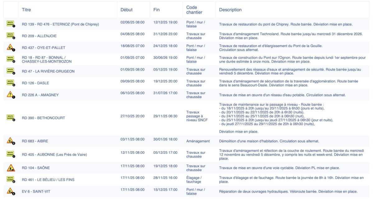 Voici les travaux qui se dérouleront du lundi 24 au vendredi 28 novembre 2025 sur les routes du département du Doubs.