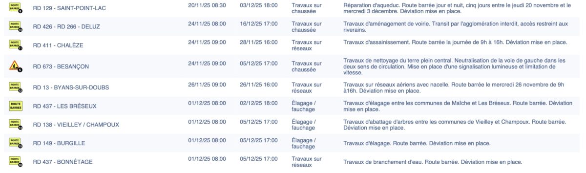 Les travaux sur les routes du Doubs (du 24 au 28 novembre 2025)