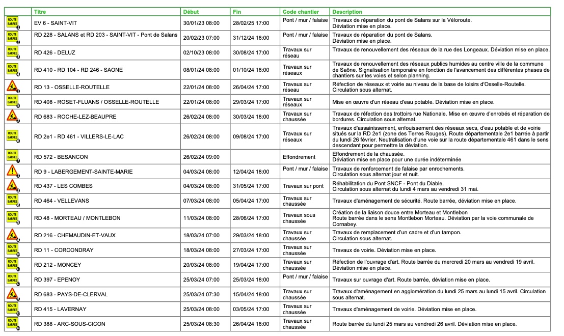 Voici les travaux qui se dérouleront du lundi 25 au vendredi 29 mars 2024 sur les routes du département du Doubs.