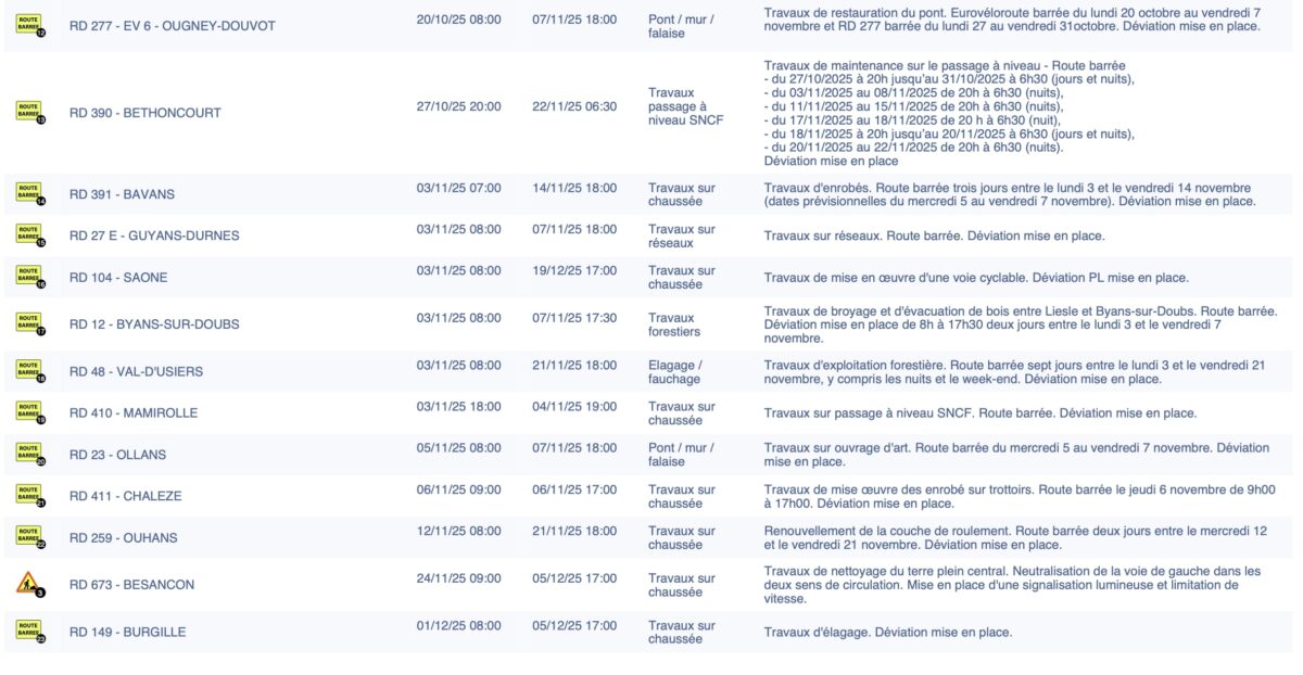 Les perturbations majeures sur le réseau départemental sont consultables sur Le site d’information du Département www.inforoute25.fr